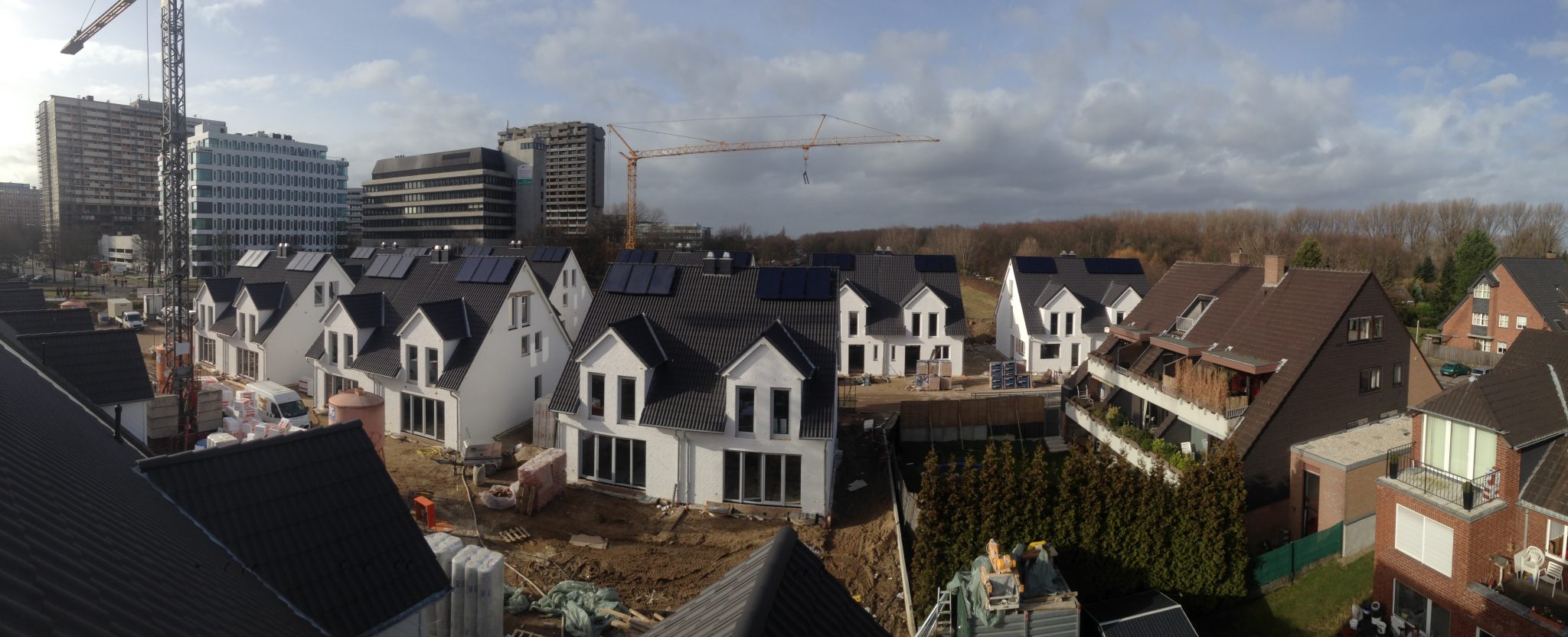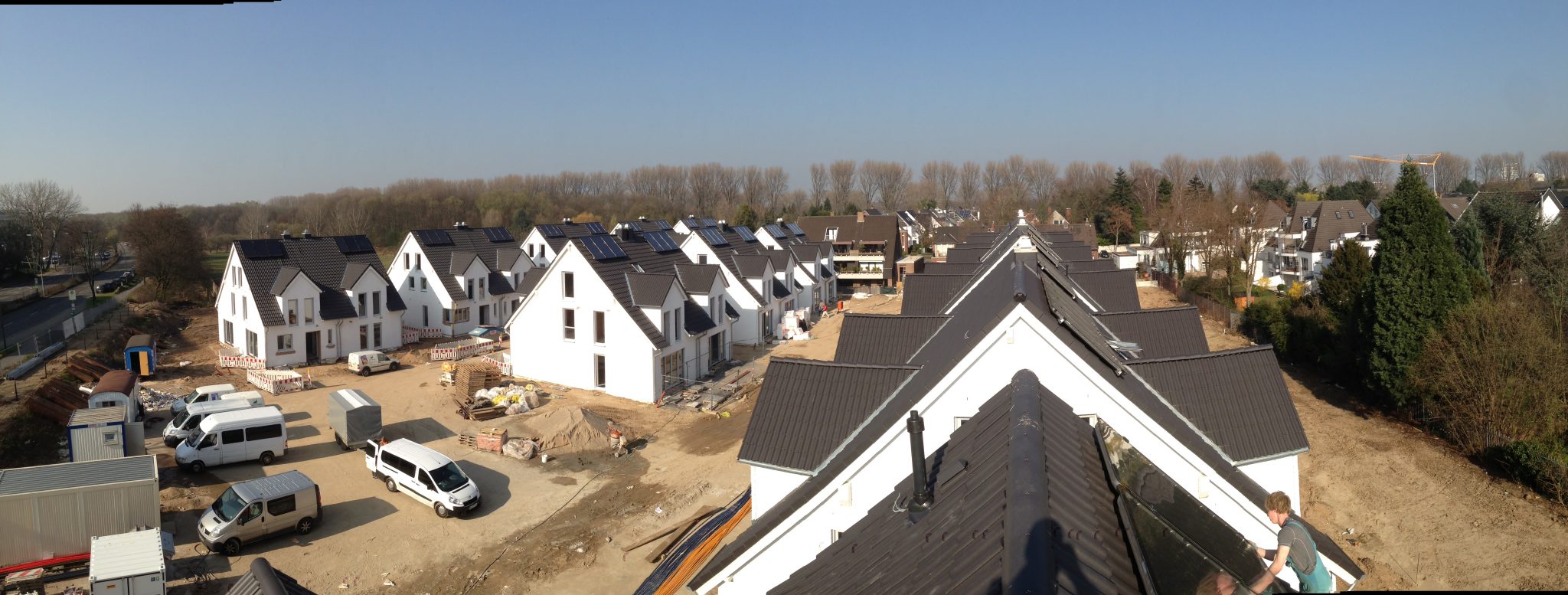 Weiße Villenzeile in Düsseldorf Niederkassel, sechsundzwanzig Doppelhaushälften mit luxuriöser Ausstattung. Alle Gebäude wurden mit mordernster Sanitär- und Heiztechnik ausgestattet, teilweise erhielten die Gebäude zusätzlich eine erweiterte Solaranlage zur Heizungsunterstützung oder wassergeführte Kaminöfen.